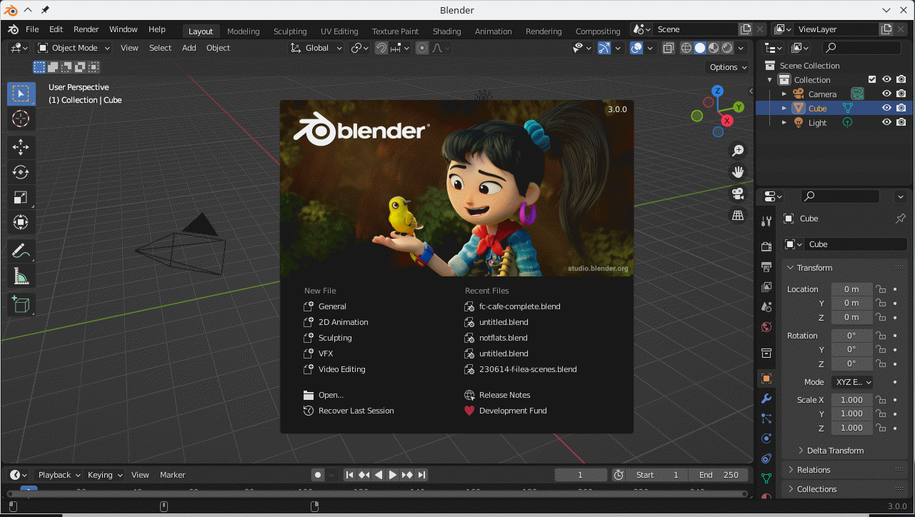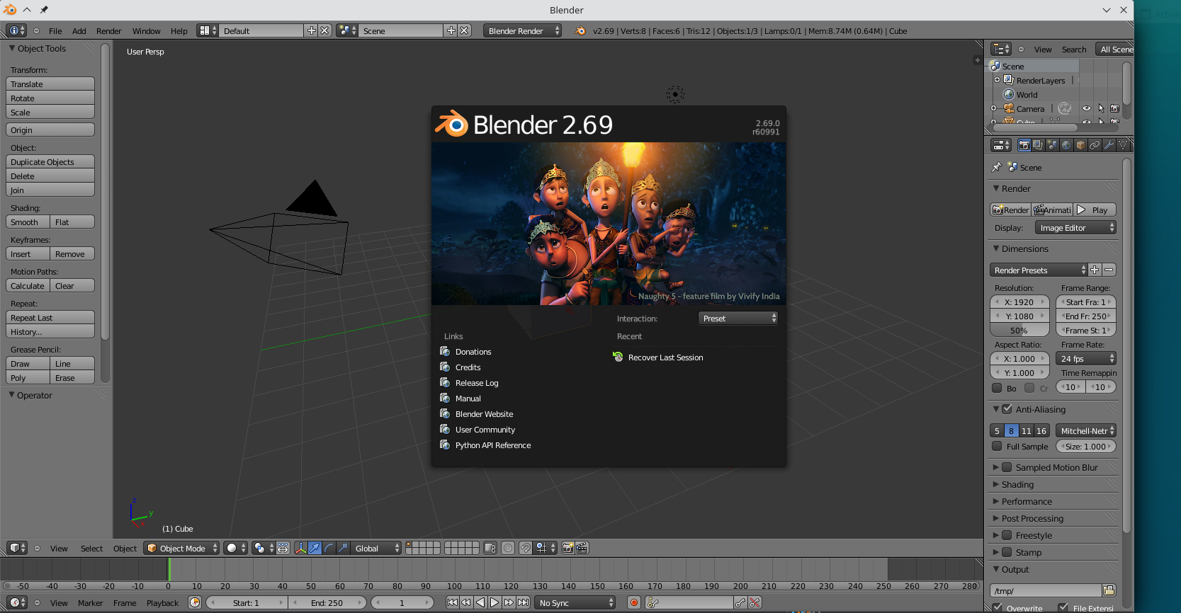 Each Blender version comes with a default start-up file. The default presents a 3D View window in the centre showing a grid in the XY plane, a cube 3D mesh, a lamp and a camera, with a grey gradient background. You can edit this and save as a new default (>File>Save Startup File) to suit your preferences. Basic editing is via the top panel which has pulldown function menus. Additional resources are placed in, the left side ***, the right side *** and the bottom panel *** with a *** window below.